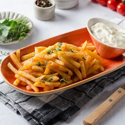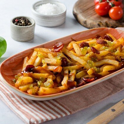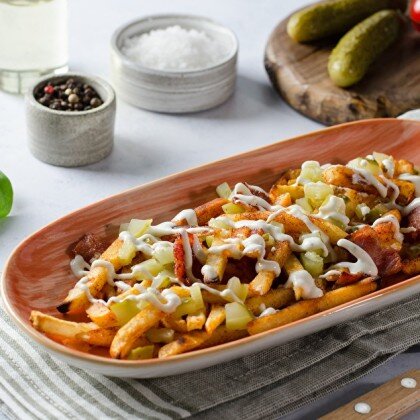Картофель фри, копченая паприка, сыр фета, сыр дор блю, соус сырный